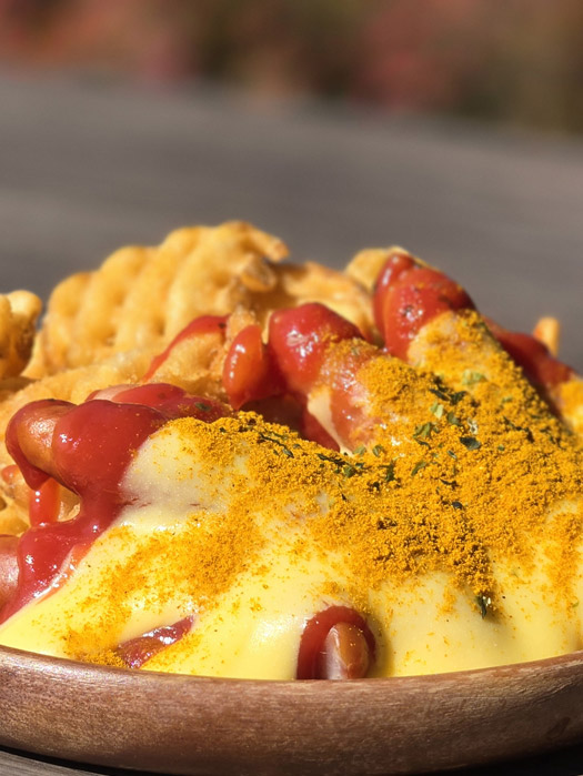 パリッとジューシーなソーセージをグリルし、たっぷりのトマトソースと食欲をそそるカレー風味のパウダーをかけた定番ドイツフードにとろけるチーズをトッピング!