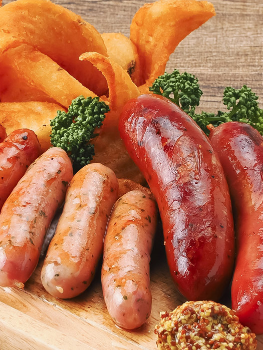 ホワイト、バジル、スモークの3種類のソーセージのお得な盛り合わせ。