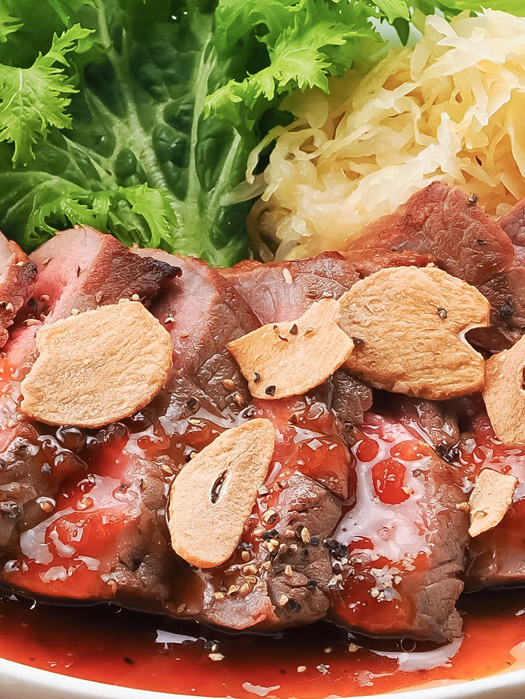 ■牛もも肉のステーキ 焦がしニンニクソース