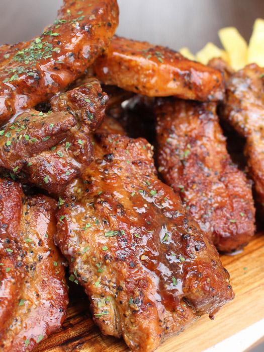 超ビッグサイズのスペアリブステーキから食べやすいように骨を処理しました。ジューシーな豚肉を甘辛いタレとスパイスで味付けし、ひと口食べれば病みつきになります!